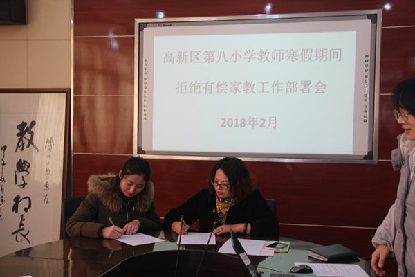 2月2日下午,高新区第八小学召开“教师寒假期间拒接有偿家教工作部署会”,集体学习并签订了《高新区第八小学寒假期间严禁教师从事有偿家教责任书》。 此承诺书禁止教师组织学生在家或到学生家中进行有偿补课、有偿辅导、有偿办班,不得单独或与他人合伙租借场地或占用其他场地进行有偿补课、有偿辅导、有偿办班,不得以父母、子女、亲友等关系的名义组织学生进行有偿补课、有偿辅导、有偿办班,不得以指导亲友子女学习或照看亲友子女生活为名进行有偿补课、有偿辅导、有偿办班,不得在社会力量培训机构中兼课或参与组织管理,不得利用职务之便组织或介绍学生到个人或社会力量培训机构有偿补课、有偿辅导、有偿办班并从中获利,不得以赢利为目的的其它形式补课、辅导、办班,不得擅自举办各类有偿培训班或兴趣班。 此承诺书的签订,将有效保证学校教师有充足的时间和精力投入到正常的教学工作,提高教育教学水平,保证学校正常教学和教育教学改革各项工作的落实。同时,有利于在教育系统中树立“重职业操守,讲职业道德”之风,办好让人民满意的教育。 | |||