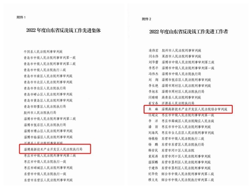 近日,山东省反洗钱工作联席会议办公室印发了《山东省反洗钱工作联席会议办公室关于通报2022年度山东省反洗钱工作先进集体和先进工作者的通知》,淄博高新区法院执行局荣获“山东省反洗钱工作先进集体”,第一审判团队员额法官朱琳荣获“山东省反洗钱工作先进工作者”。