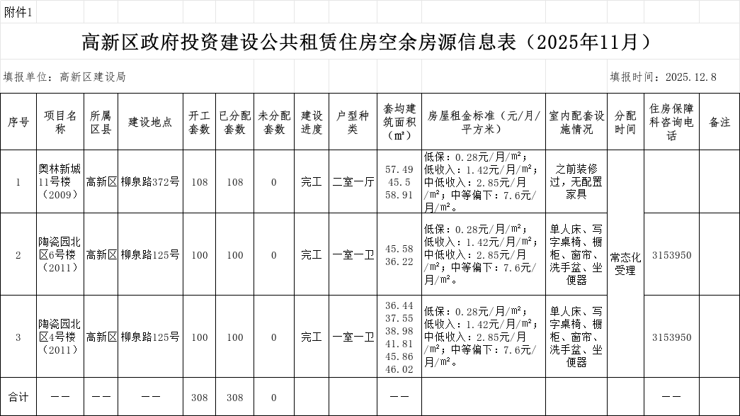 保障性住房空余房源信息表(高新区2025年11月)