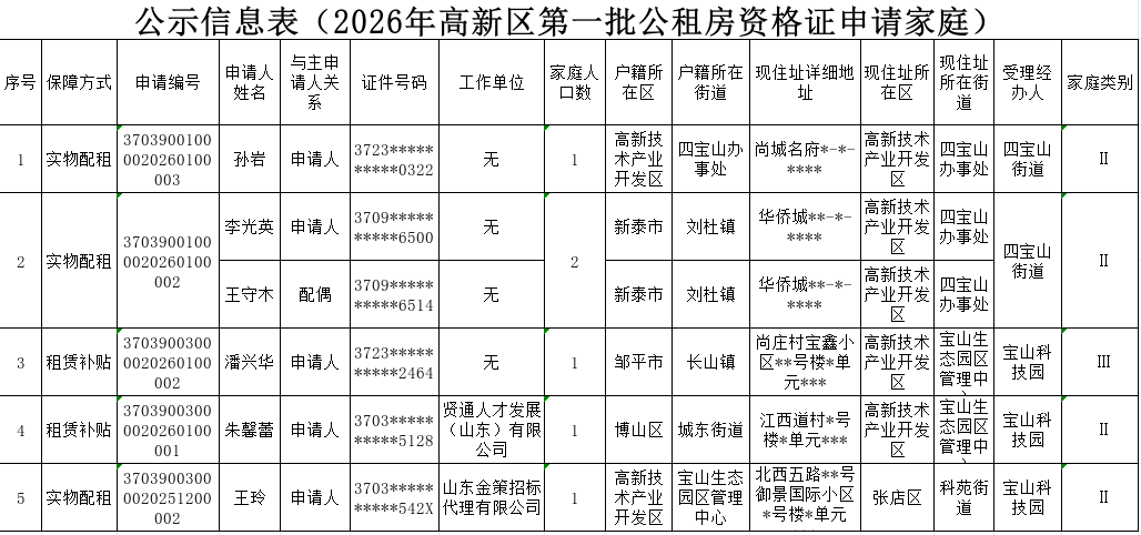 根据《淄博市人民政府办公室关于印发淄博市公共租赁住房保障办法的通知》(淄政办发〔2025〕3号)和《淄博市人民政府办公室关于公布淄博市住房保障相关标准的通知》(淄政办字〔2019〕92号)及相关规定,现将我区2026年第一批5户申请公共租赁住房保障资格家庭向社会公示,公示期为2026年1月28日—2026年2月3日。如有异议,请予以举报,举报电话:3153950。公示期内无异议或经调查异议不成立的,将予以发放《公共租赁住房资格证》。