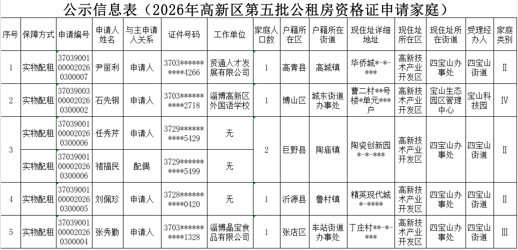 根据《淄博市人民政府办公室关于印发淄博市公共租赁住房保障办法的通知》(淄政办发〔2025〕3号)和《淄博市人民政府办公室关于公布淄博市住房保障相关标准的通知》(淄政办字〔2019〕92号)及相关规定,现将我区2026年第五批5户申请公共租赁住房保障资格家庭向社会公示,公示期为2026年4月8日—2026年4月14日。如有异议,请予以举报,举报电话:3153950。公示期内无异议或经调查异议不成立的,将予以发放《公共租赁住房资格证》。