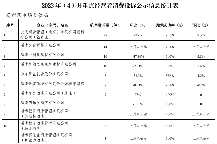 根据淄博市市场监管局、淄博市消保委《关于开展重点经营者消费投诉集中公示的通知》要求,现将2023年4月份高新区市场监管局受理的消费投诉情况进行公示。