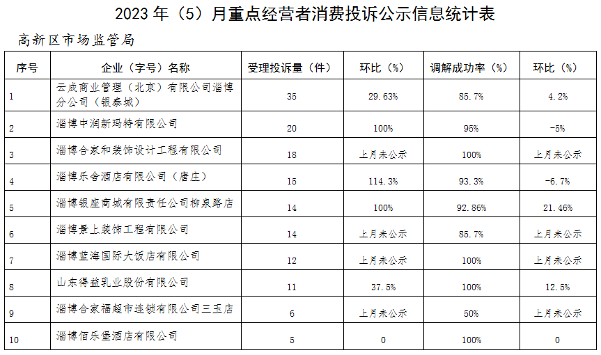 根据淄博市市场监管局、淄博市消保委《关于开展重点经营者消费投诉集中公示的通知》要求,现将2023年5月份高新区市场监管局受理的消费投诉情况进行公示。