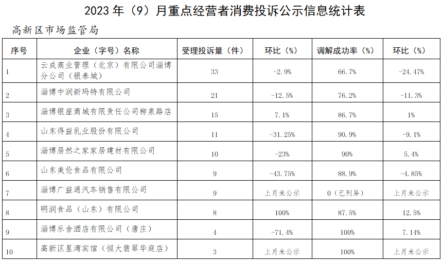 根据淄博市市场监管局、淄博市消保委《关于开展重点经营者消费投诉集中公示的通知》要求,现将2023年9月份高新区市场监管局受理的消费投诉情况进行公示。