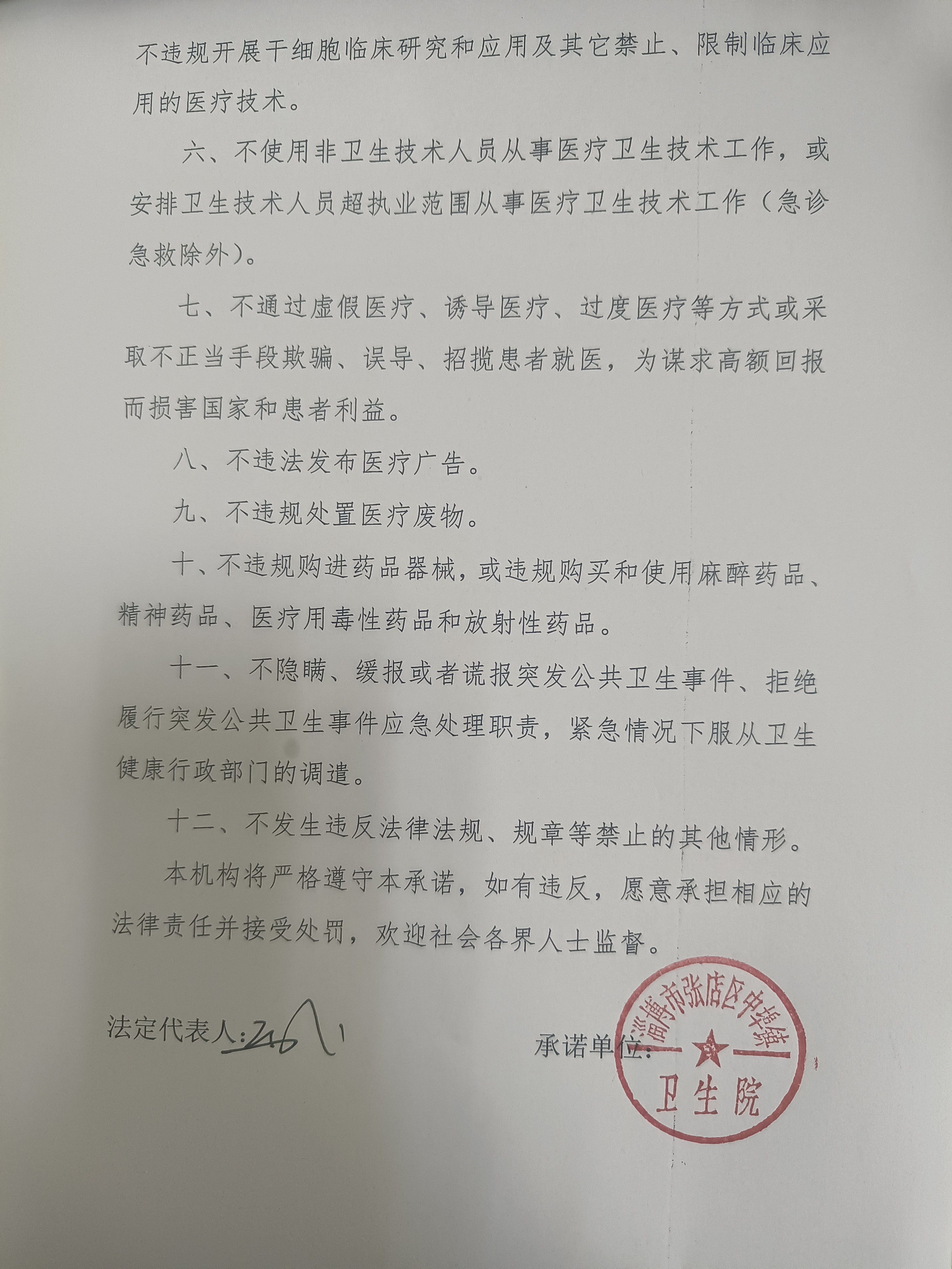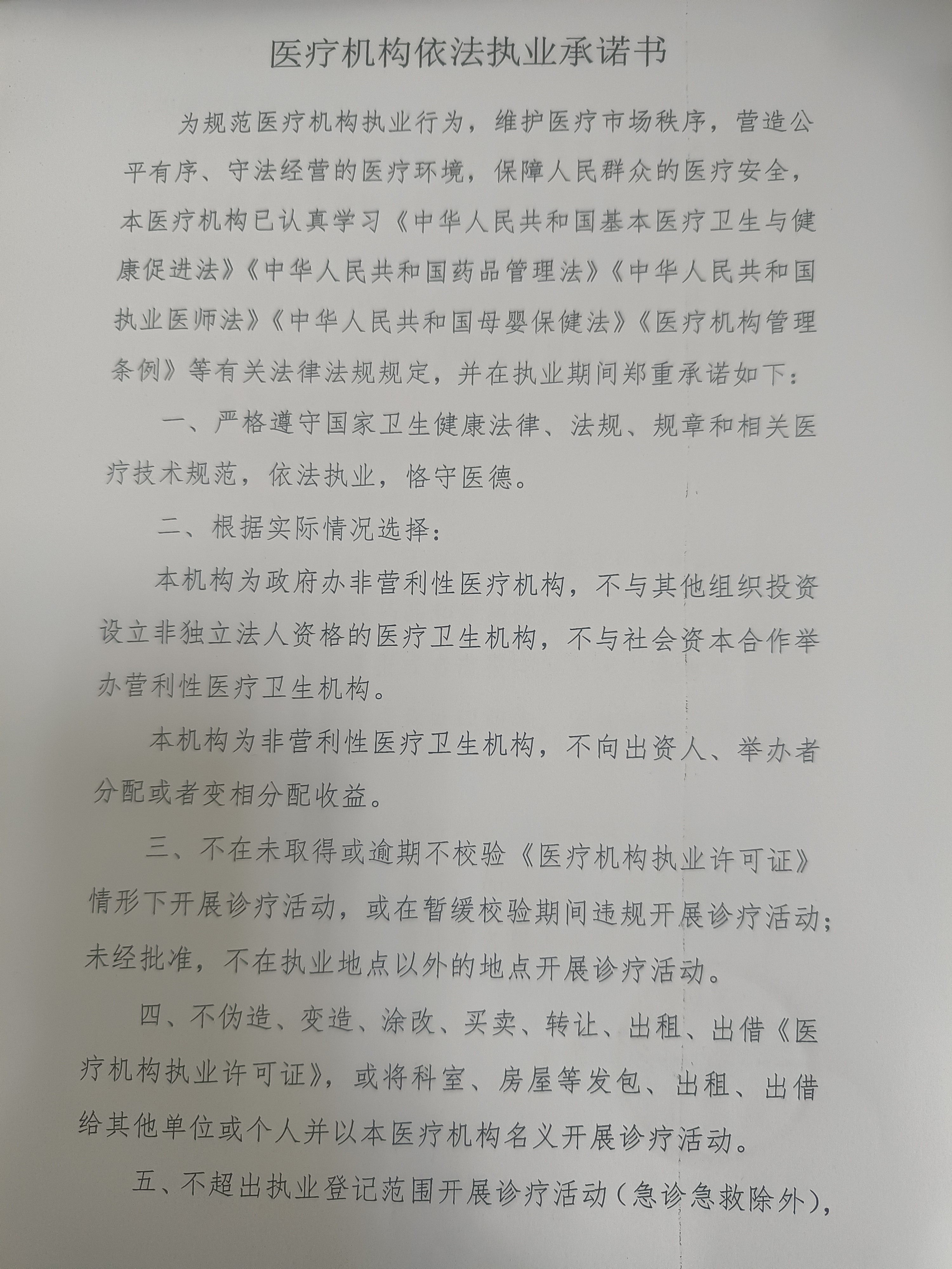 淄博市张店区中埠镇卫生院医疗机构依法执业承诺书