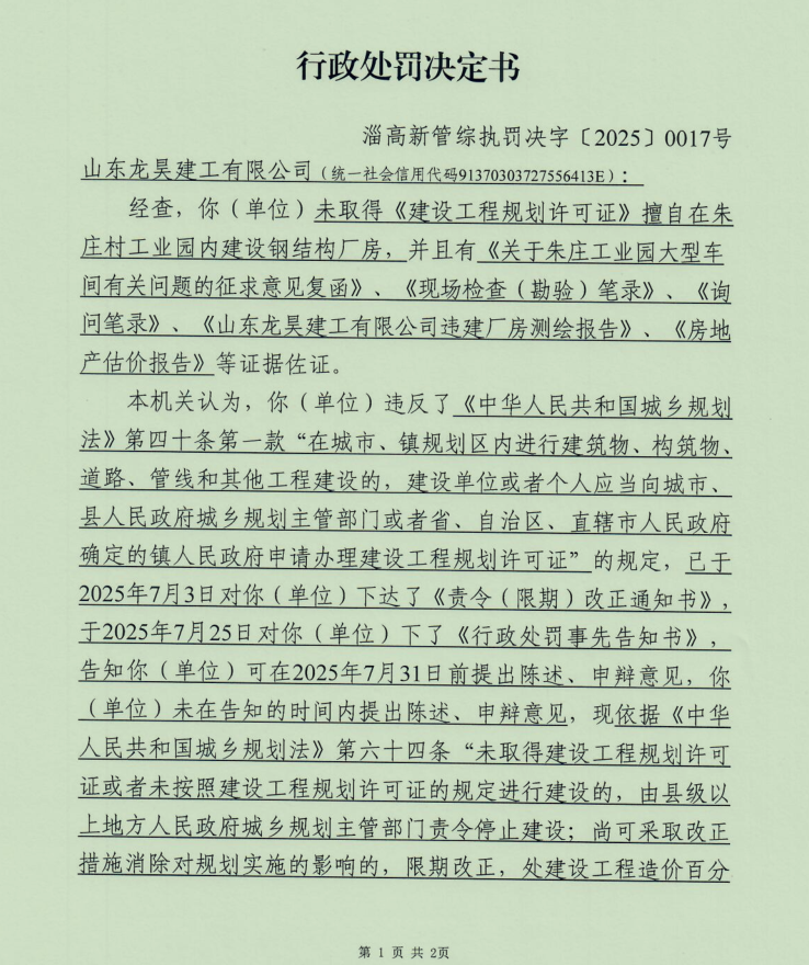 淄高新管综执罚字【2025】第0017号